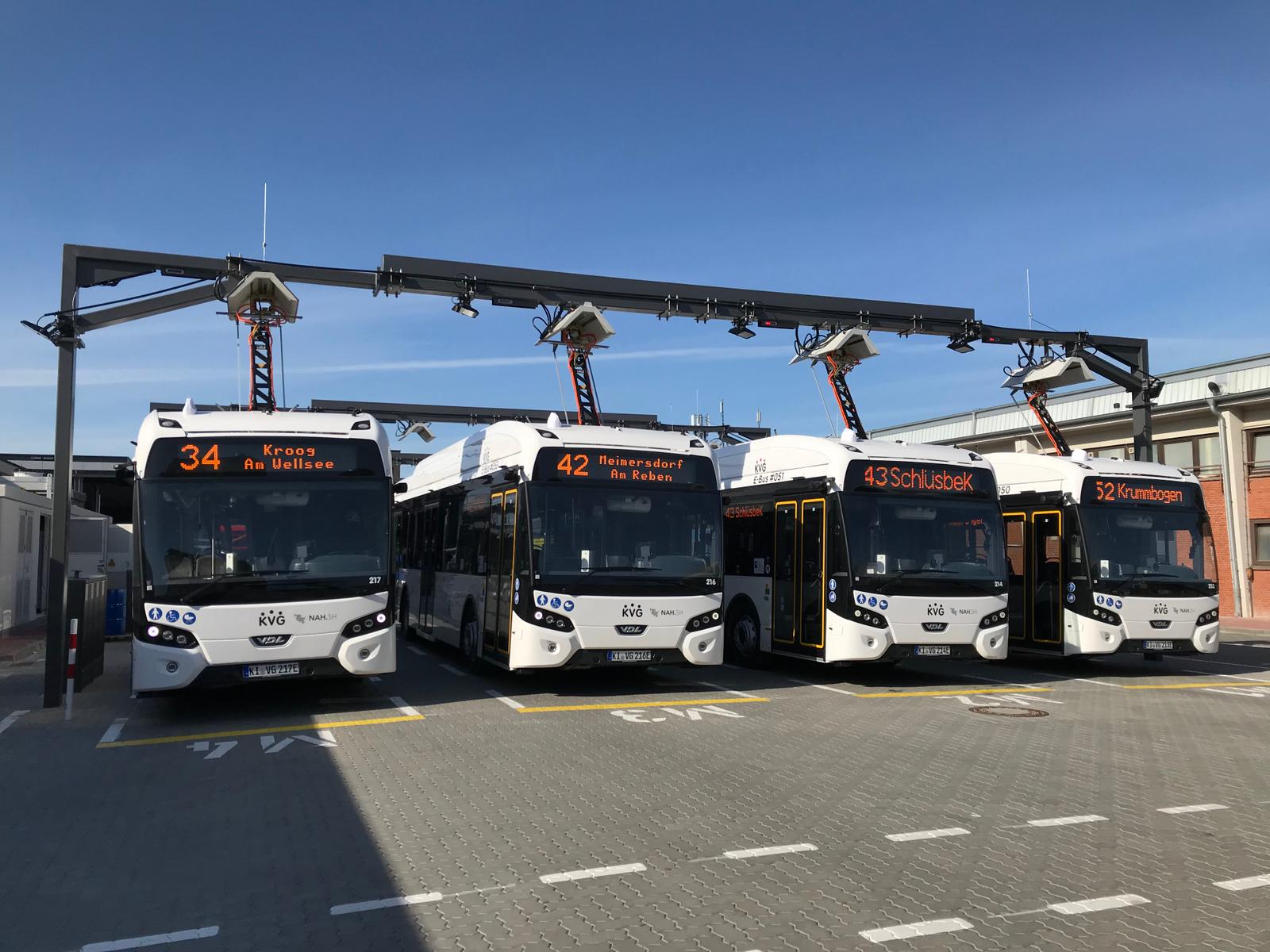 Die ersten vier vollelektrischen 12-Meter-Busse der KVG rollen durch Kiel und laden nun auch am CITTI-PARK und in Kronshagen