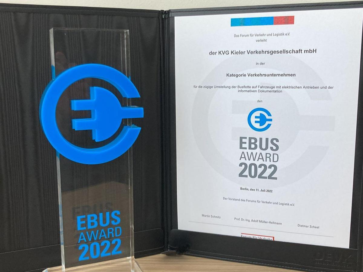 Die KVG Kieler Verkehrsgesellschaft mbH war eins von drei nominierten Verkehrsunternehmen und hat in Berlin den EBUS Award 2022 in der Kategorie „Zügige Einführung von elektrischer Antriebstechnik“ erhalten.