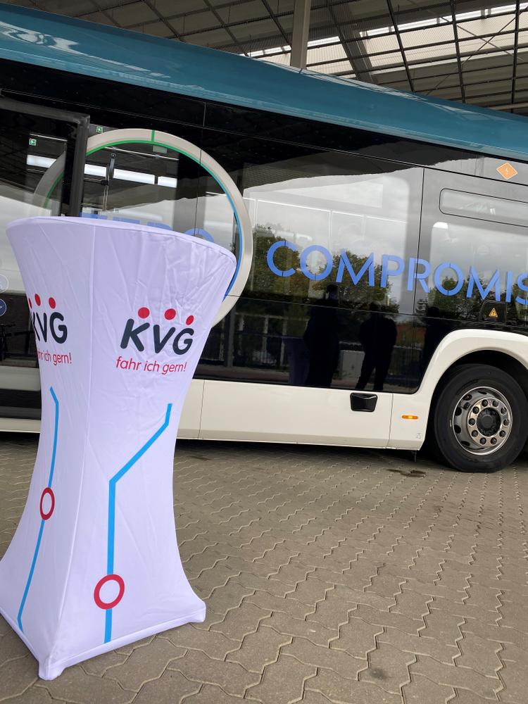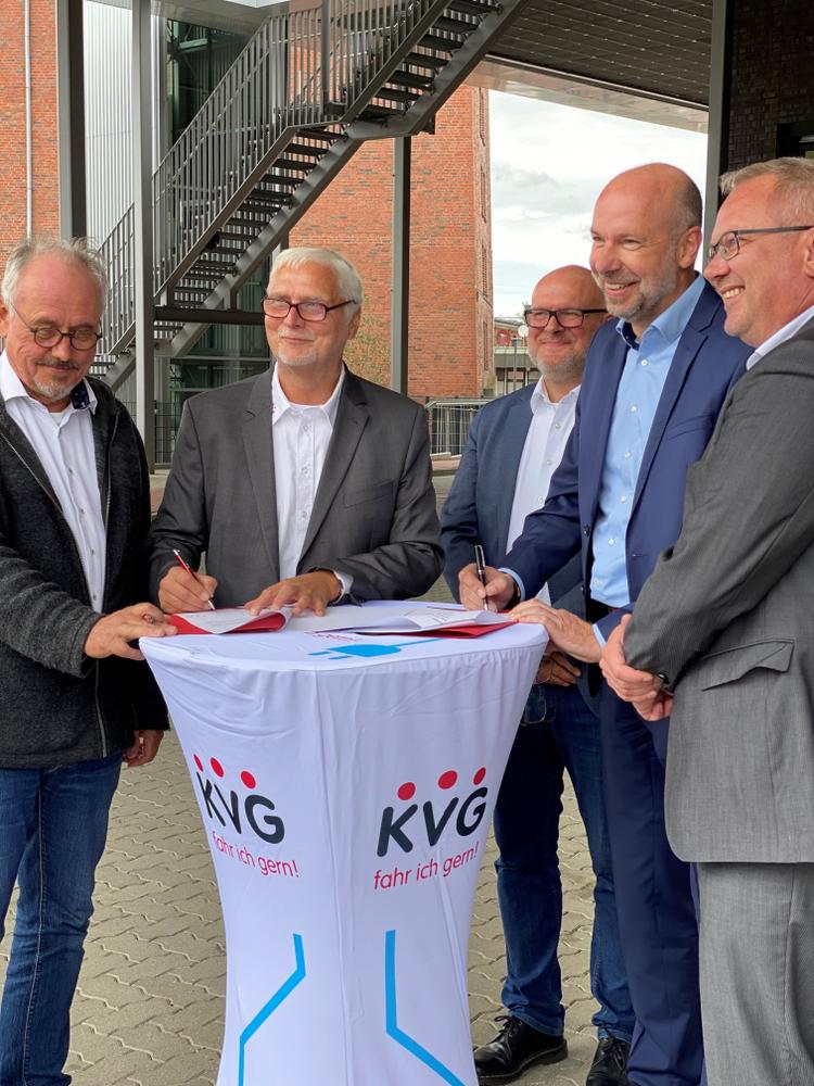 Die feierliche Vertragsunterzeichnung fand am 13.09.2023 auf dem Betriebshof Werftstraße der KVG statt. In diesem Rahmen konnte auch ein erster Demobus der neuesten Generation von VDL in Augenschein genommen werden.