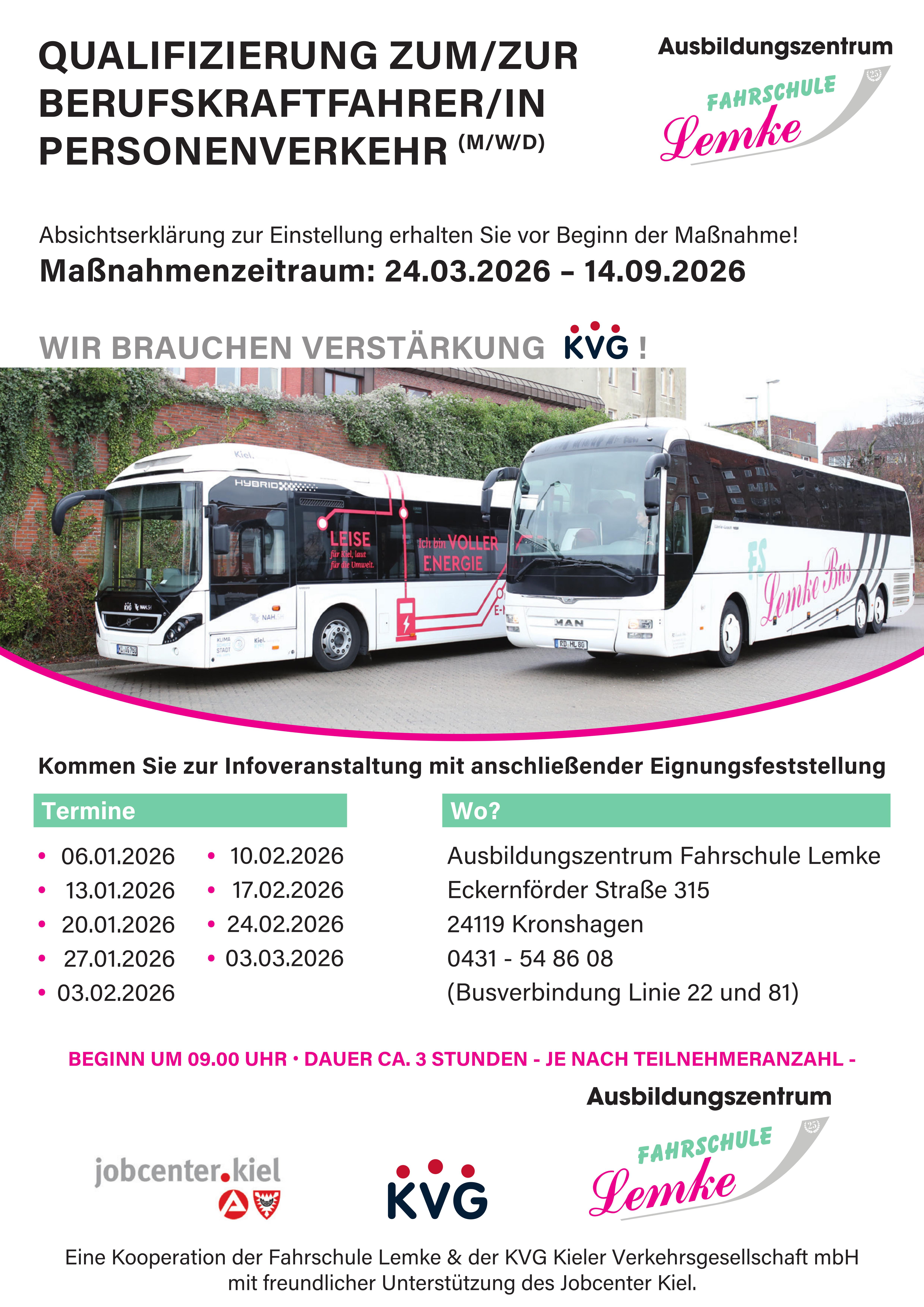 Die KVG Kieler Verkehrsgesellschaft mbH verfügt über die größte Bus-Fahrschule Schleswig-Holsteins. Dort bilden wir 3x im Jahr innerhalb von sechs Monaten motivierte Quereinsteiger*innen zu Busfahrer*innen aus. Egal aus welcher Branche sie stammen und in welchem Beruf sie vorher gearbeitet haben. Dafür stehen selbstverständlich freundliche und kompetente Dozent*innen und Fahrlehrer*innen sowie moderne Schulungsräume und Fahrschulbusse zur Verfügung.